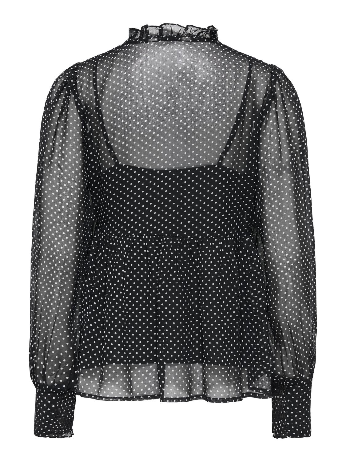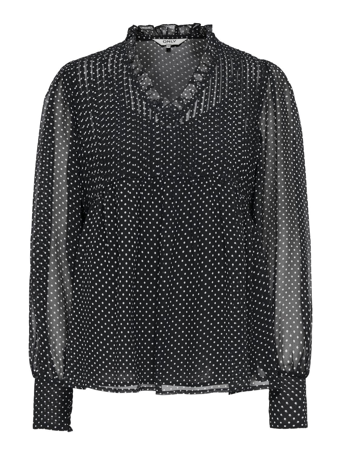 ONLFEDJA L/S V-NECK DETAIL TOP WVN er en elegant og moderne topp som kombinerer stil med bærekraft. Laget av resirkulert polyester, gir denne toppen både komfort og et miljøvennlig valg. Den svarte fargen med hvite prikker gjør den til et allsidig plagg som kan brukes til ulike anledninger.