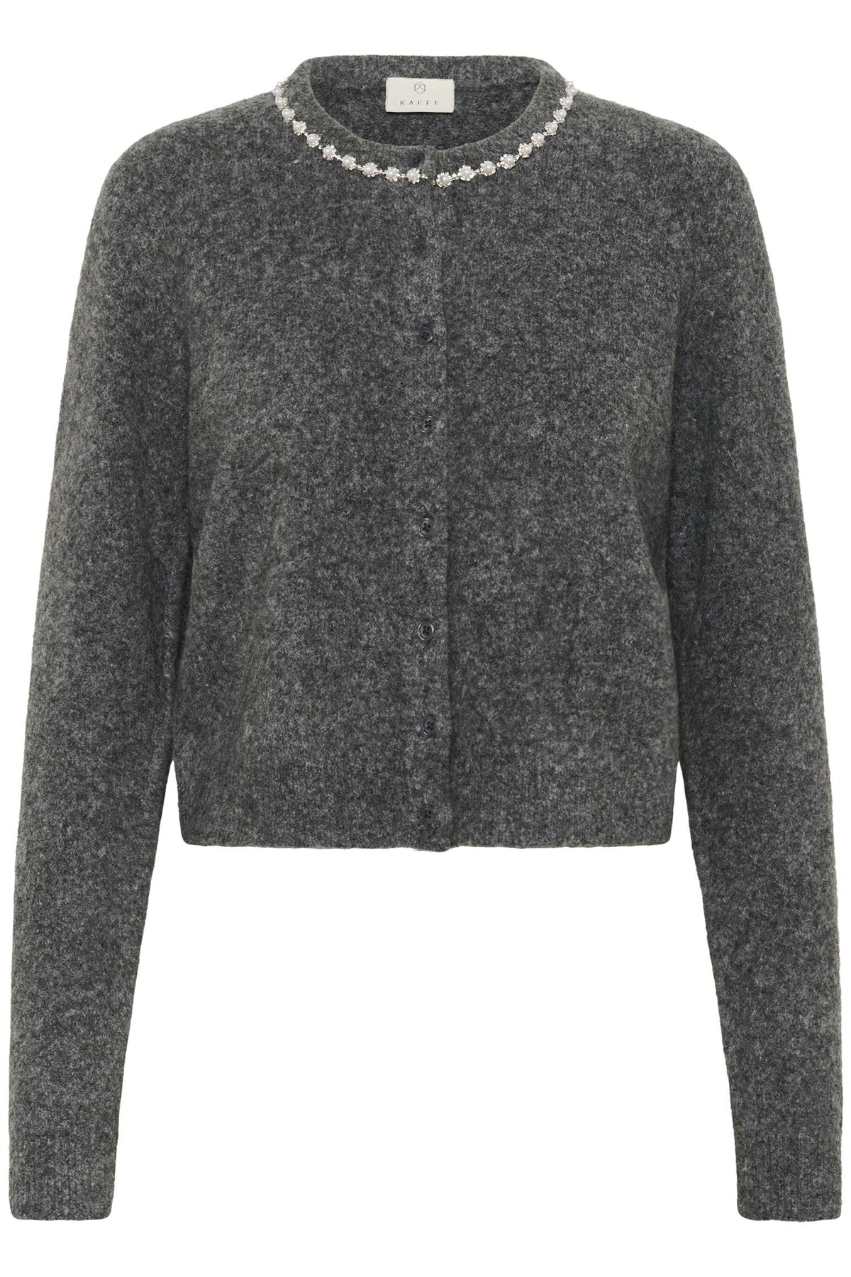 KAroxy Cardigan i grå melange er en stilren og komfortabel strikkegenser som passer perfekt for hverdagsbruk. Den er laget av en blanding av resirkulert polyester, akryl og sertifisert ull, noe som gir både varme og pusteevne.