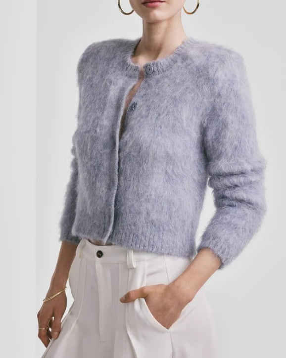 Hairy Knit-jakken er laget av vår svært myke og lodne blanding av RAS-sertifisert garn. Jakken har en rett silhuett, lange ermer og rund hals. Mansjettene, halsen og falden har vakre ribbedetaljer. Jakken lukkes foran med skjulte trykknapper.
