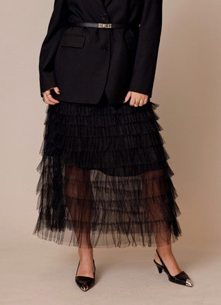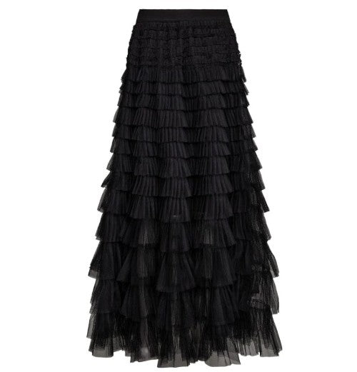 Svart gulvlangt skjørt fra Co'Couture med lag på lag av rynker og volanger. Skjørtet har en myk elastisk kant i midjen og et voluminøst design.