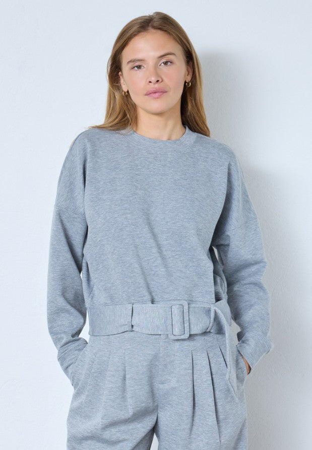 Gråmelert genser fra Co´Couture med bredt belte og stor spenne integrert i designet.