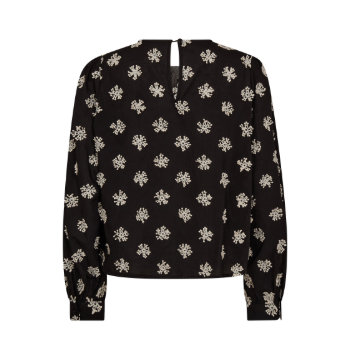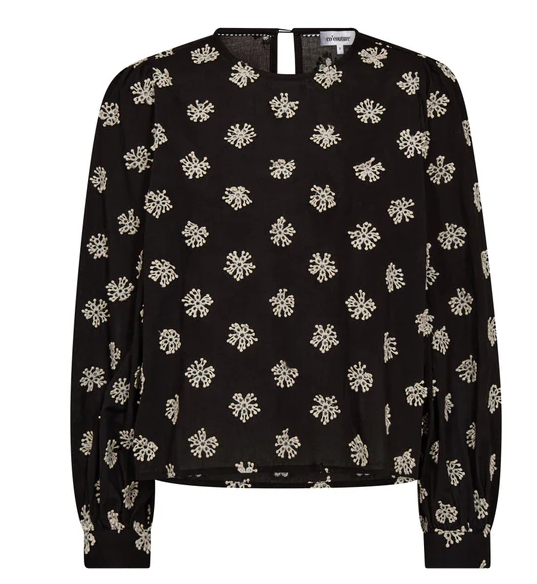 Blusen er svart med påsydd broderi i off-white. Den har lange ermer og rund hals med knapp bak. Den er perfekt for å piffe opp et kjedelig hverdagsantrekk eller en tur rundt i byen.