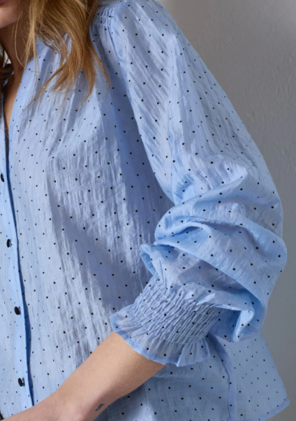 Klassisk og feminin bluse fra Co’Couture i delikat lyseblå med elegante sorte dots. DallyCC Dot V-Shirt kombinerer et tidløst mønster med moderne detaljer som sorte kontrastknapper i front og elastikk nederst på ermene. En lett og anvendelig bluse som passer like godt til jobb som til hverdags.