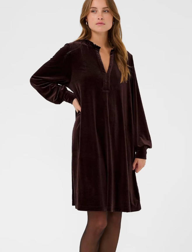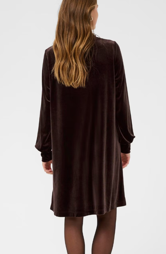 KAkelly Flounce Dress er en elegant kjole som kombinerer stil og komfort. Med sitt A-formede snitt og knelengde, er denne kjolen perfekt for både hverdagsbruk og spesielle anledninger. Den dype fargen Black Coffee gir et sofistikert preg som passer til enhver anledning.
