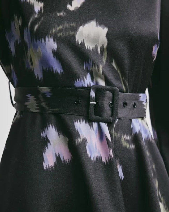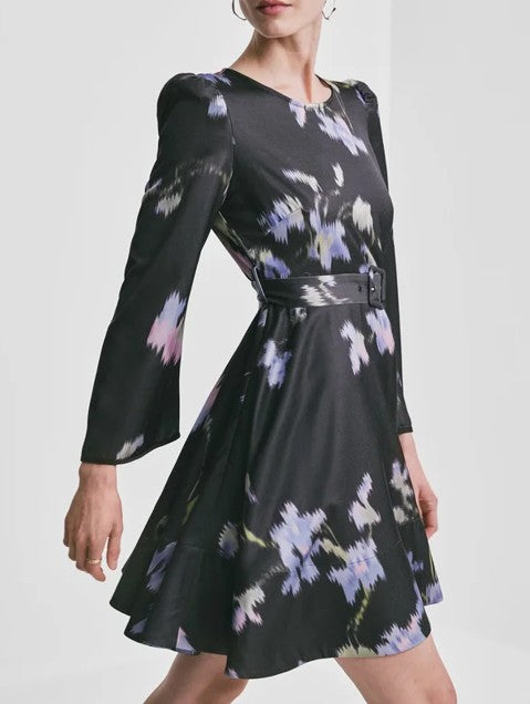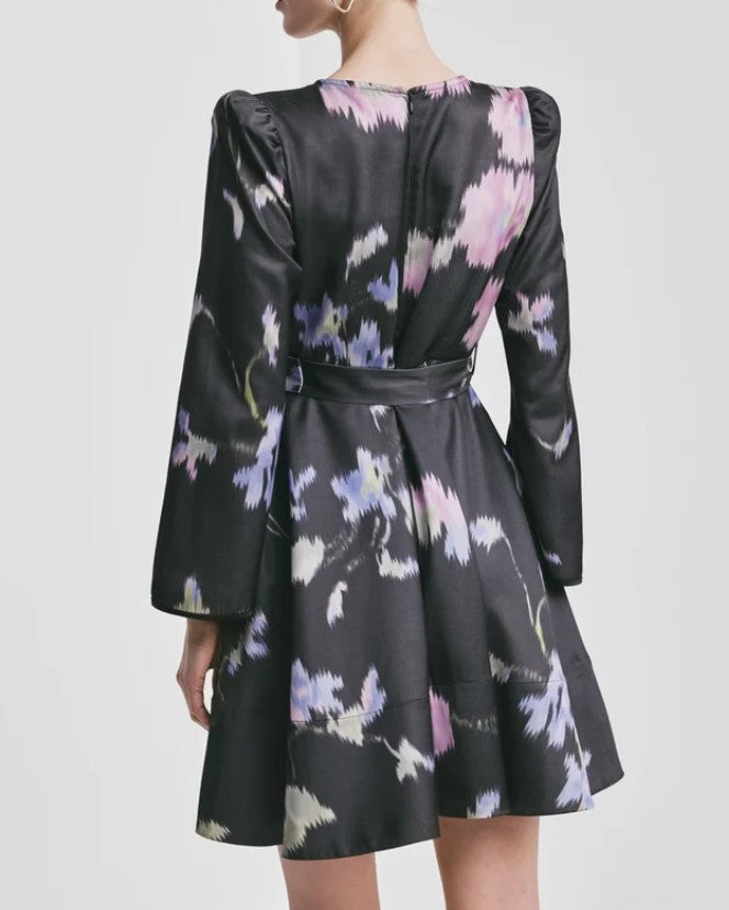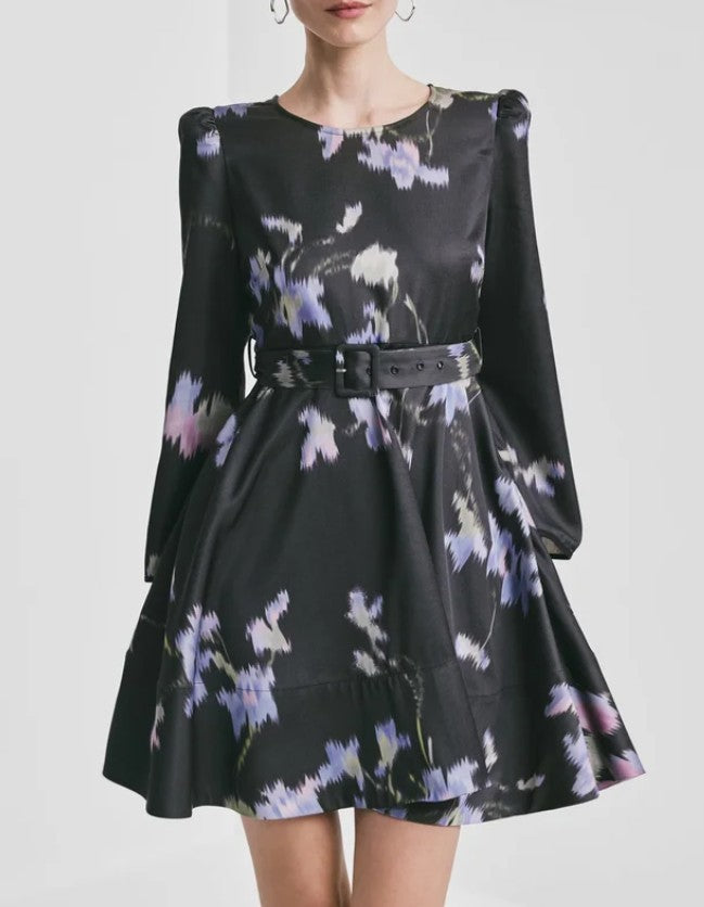 Den skreddersydde satengminikjolen er laget av vårt strukturerte, skinnende og tunge FSC-sertifiserte stoff. Kjolen har en minilengde, tettsittende midje, rund hals og lange ermer med lett puffede skuldre. Den leveres med et matchende belte og lukkes bak med glidelås.