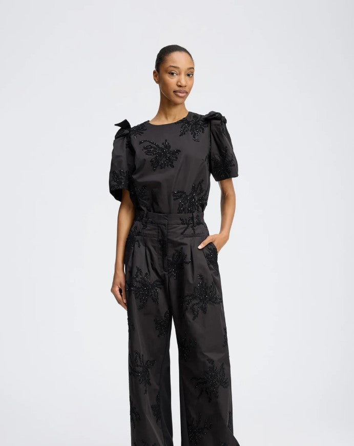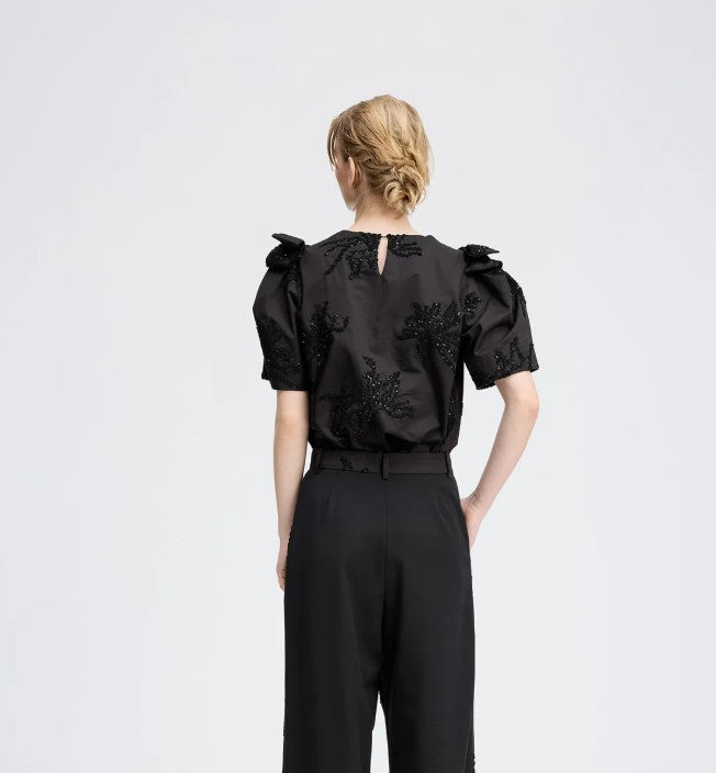 Elegant svart bluse med korte, vide ermer og dekorativt paljettbroderi. Blusen har en løs passform og vakre detaljer på skuldrene, noe som skaper et eksklusivt og festlig utseende.