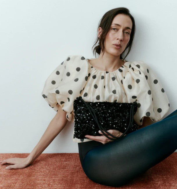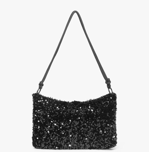 En festredo axelväska täckt av paljetter som reflekterar ljuset och skapar ett lekfullt uttryck. Remmen har en fin knutdetalj och kan tas av, så väskan även kan användas som clutch. Den stängs med en diskret nedsänkt dragkedja och har en innerficka med dragkedja för dina viktigaste saker.