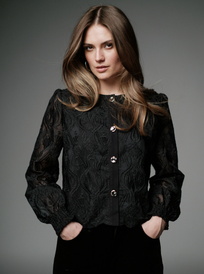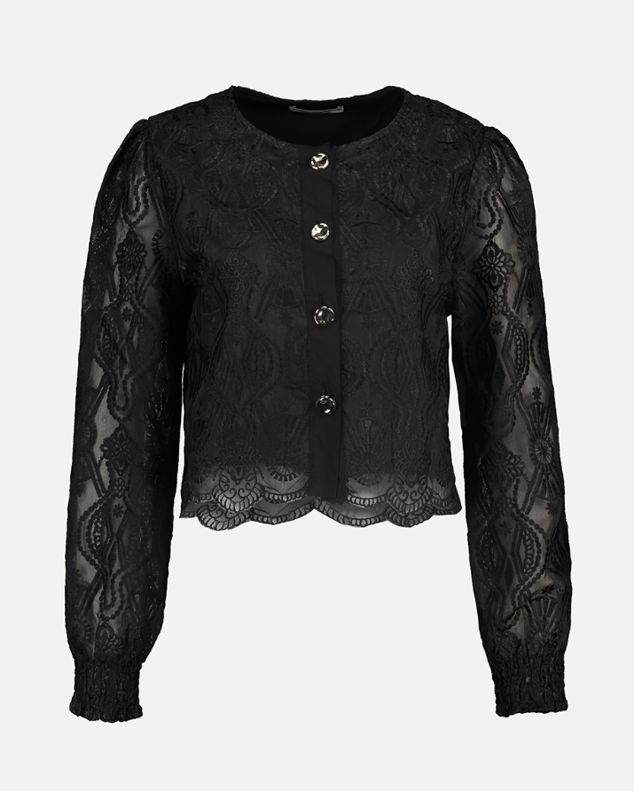 Denne jakken er laget i gjennomsiktig organza med broderte detaljer som gir den en blondeaktig look. Den er helfòret i kroppen for behagelig bruk, mens ermene og den bølgete kanten nederst er uforet for å gi et lett og sofistikert uttrykk. De dekorative gullknappene med hamret, men blank finish tilfører et eksklusivt preg. Den har lange ermer med puff på skuldrene og smock ytterst.