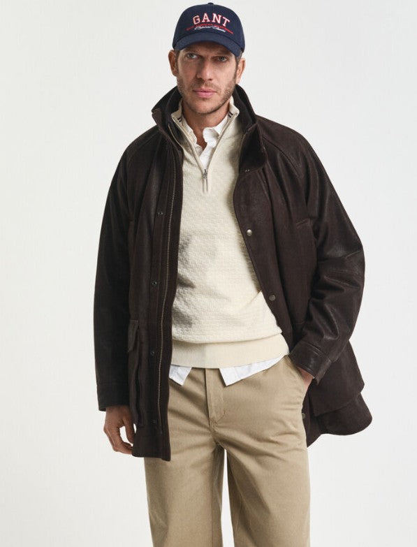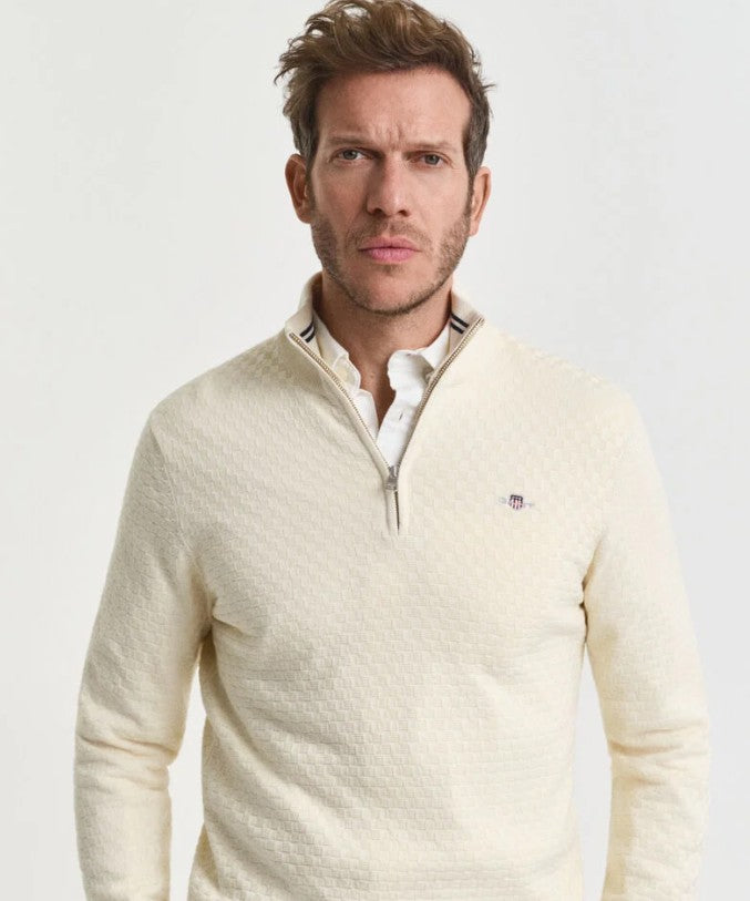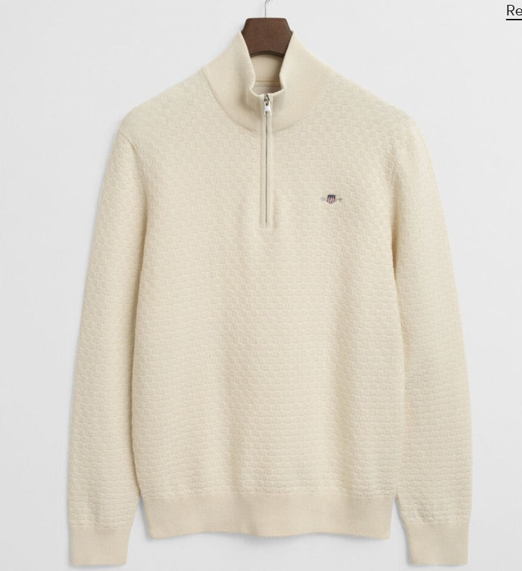 Dekorativ og komfortabel genser i en bomull-merinoull-blanding med halv glidlås og myk tekstur.