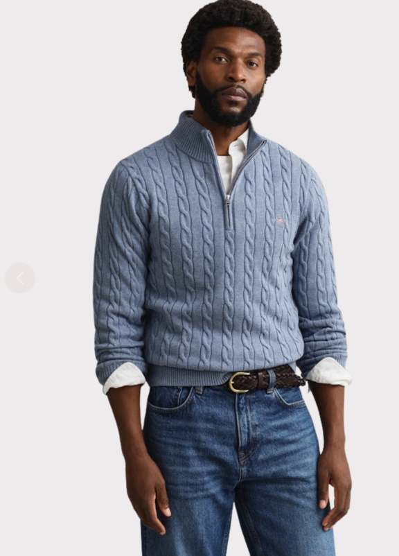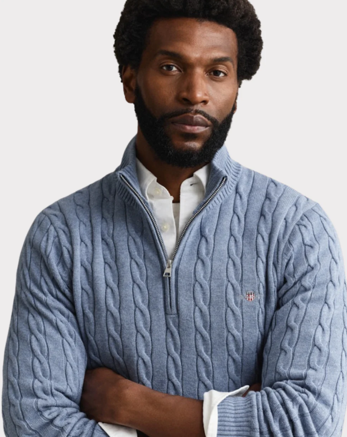 Den myke genseren i 100% bomull har en all-over kabelstrikkstruktur og en sporty halv-zip krage. Med en regulær passform og ribbestrikkede detaljer ved hals, hem og mansjetter, er dette et preppy essensielt plagg. Den ikoniske GANT-skjoldet er brodert på brystet, noe som gir et stilrent preg.