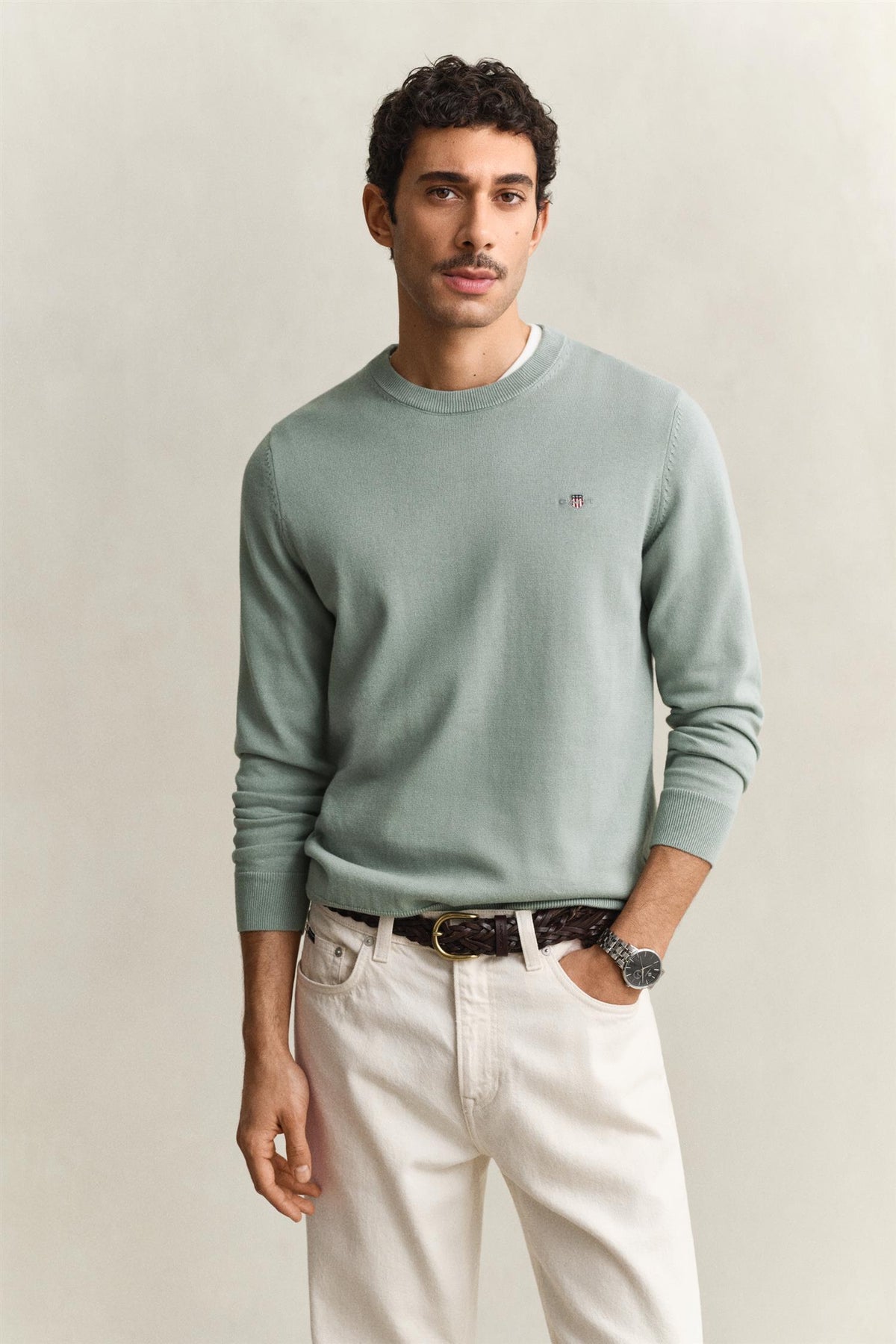 Classic Cotton C-Neck er en stilren genser laget av 100% bomull, designet for komfort og holdbarhet. Den har en regular fit og et tidløst crew neck-design, samt en GANT-skjoldgrafikk brodert på brystet. Perfekt for en avslappet stil.