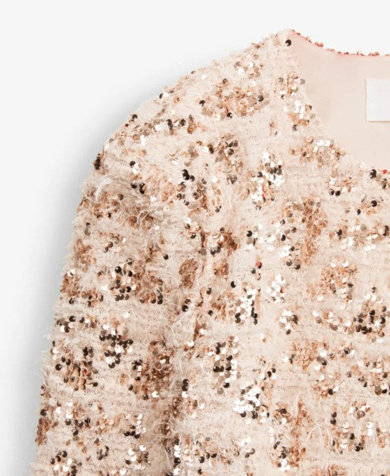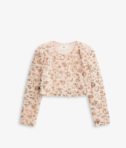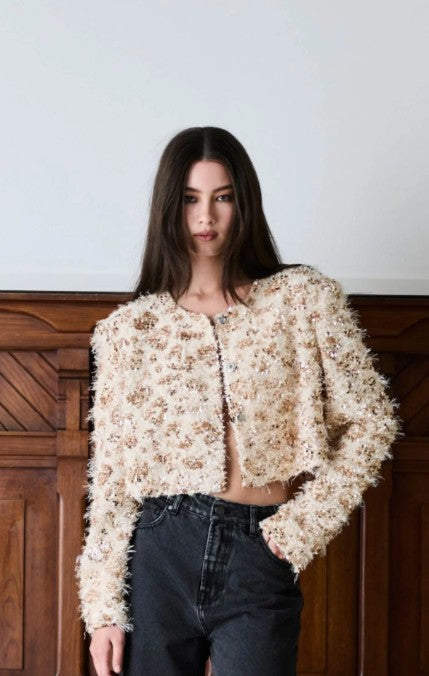 Gå inn i uanstrengt eleganse med Glitz-jakken, et statement-plagg designet for å løfte ethvert antrekk. Denne jakken kombinerer en teksturert stoffbase med spredte paljettdetaljer, noe som skaper en subtil, men iøynefallende glitter som føles både moderne og raffinert. De nøye plasserte glitteraksentene fremhever det teksturerte stoffet, og skaper en unik dybde og en raffinert glitter som løfter jakkens design.