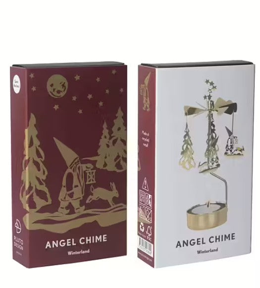 En julenisse trasker gjennom snøen med vennen sin. En engel som sprer julestemning i hjemmet ditt! Laget av gullmetall.
