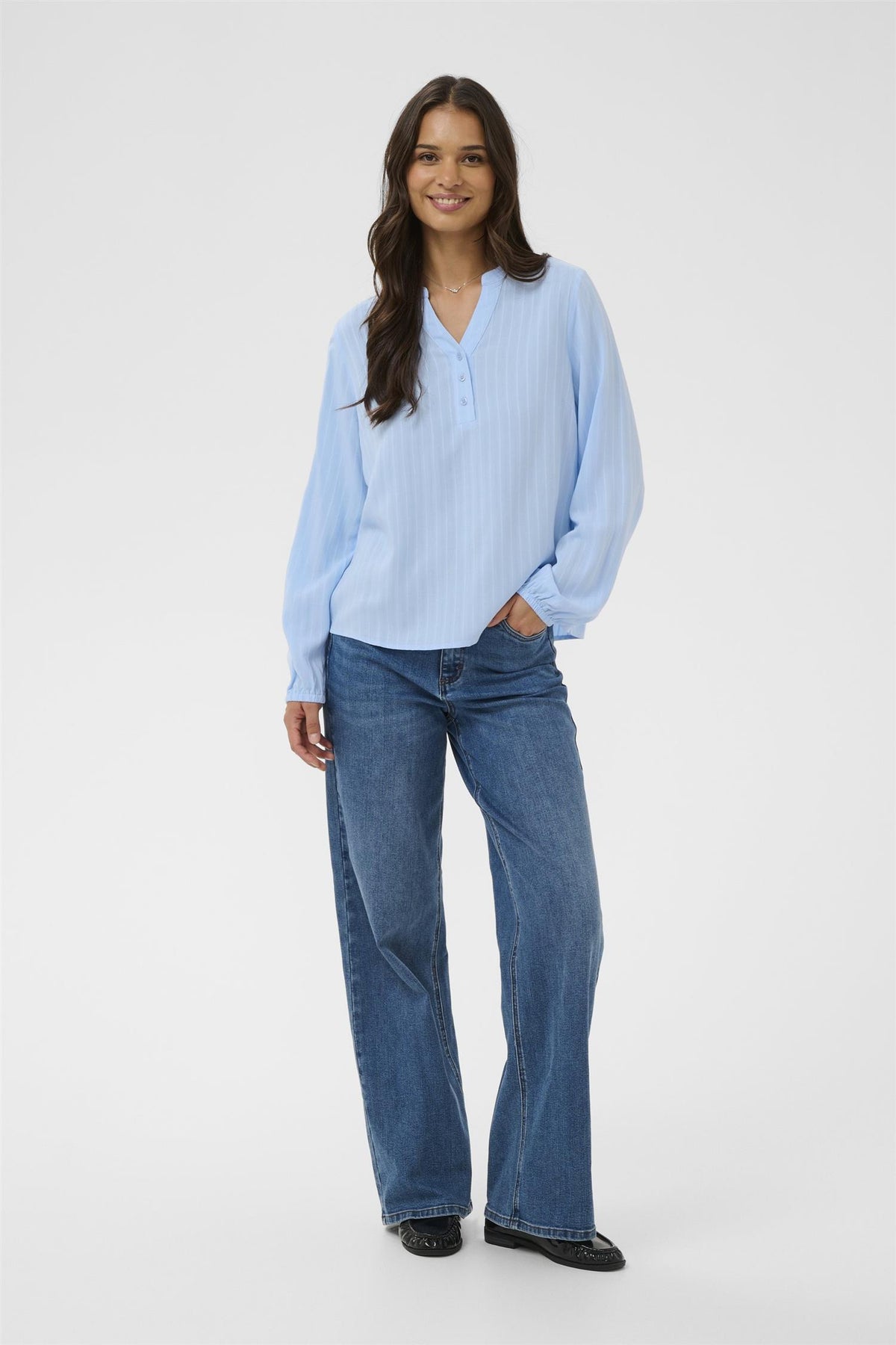 KAninna Blouse i en delikat powder blue farge er laget av 100% viskose, noe som gir en myk og behagelig følelse mot huden. Denne blusen har en regular fit som gjør den enkel å style for både hverdagsbruk og mer formelle anledninger.